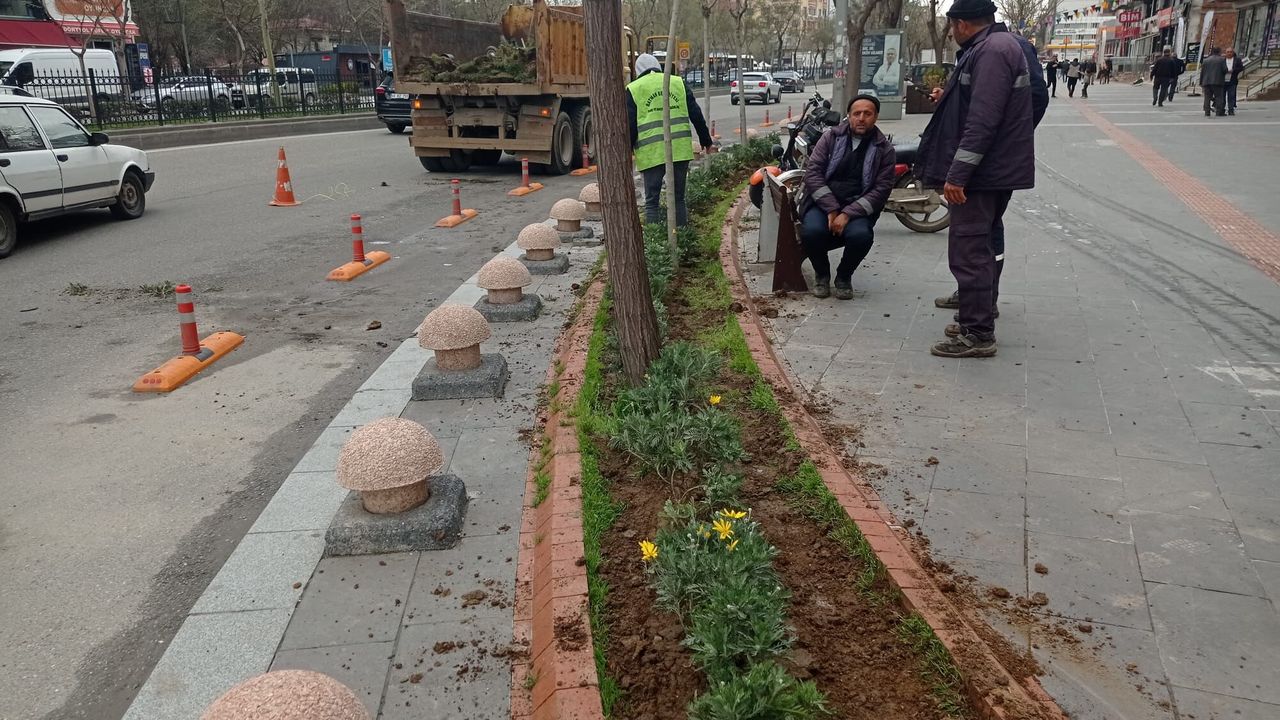 Şehrin farklı noktalarında yürütülen peyzaj ve yeşillendirme çalışmaları kapsamında papatya, zakkum ve kartopu çalısı gibi bitkiler toprakla buluşturulurken, kuruyan ve ömrünü tamamlayan ağaçların yerine de yeni fidanlar dikiliyor.