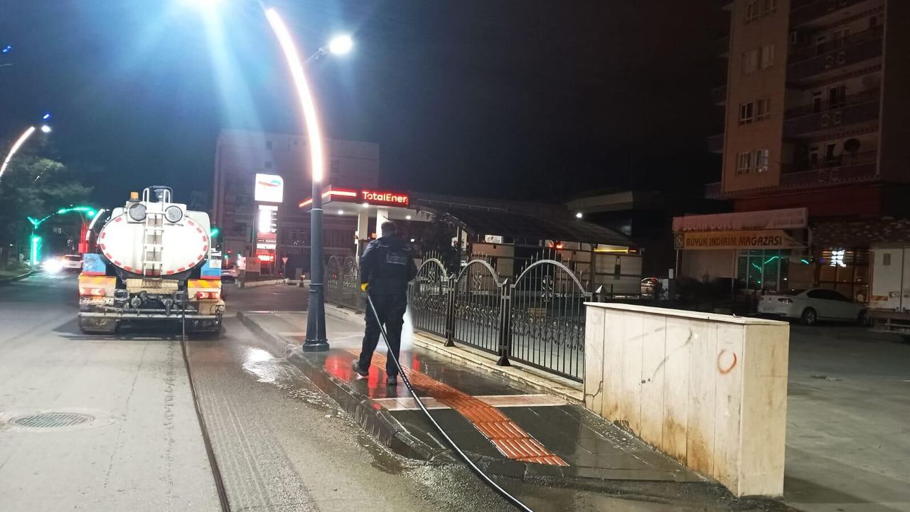 Özellikle toplu taşıma araçlarının yoğun şekilde kullanıldığı bu bölgede, otobüs durakları, oturma bankları ve kaldırımlar da dezenfektanlı su ile yıkanarak hijyenik hale getirildi.