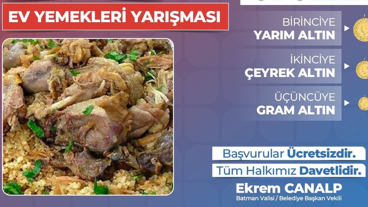 9 Kasım Pazar günü Valilik önünde gerçekleştirilecek yarışmada, Batmanlı usta aşçılar en özgün tariflerini ve yöresel lezzetlerini sergileyecek. Katılımcılar, özenle hazırladıkları ev yemekleriyle jüri karşısına çıkarak “Batman’ın en lezzetli yemeği” unvanı için mücadele edecek.