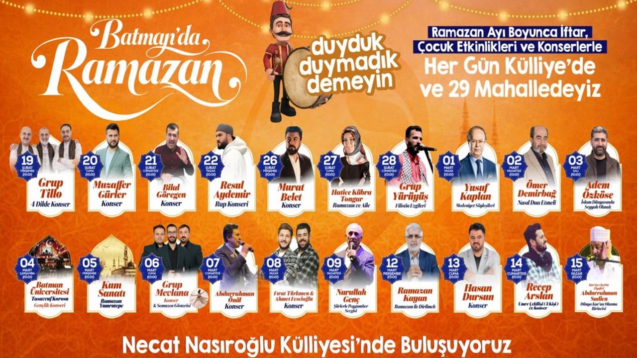 ‘Batman'da Ramazan Bir Başka Güzel’ sloganıyla hazırlanan etkinlik takviminde konserler, söyleşiler, ilahi dinletileri ve çocuklara özel etkinlikler yer alıyor. Hem yetişkinlere hem de miniklere hitap eden programlarla Ramazan’ın manevi atmosferi dolu dolu yaşanacak.