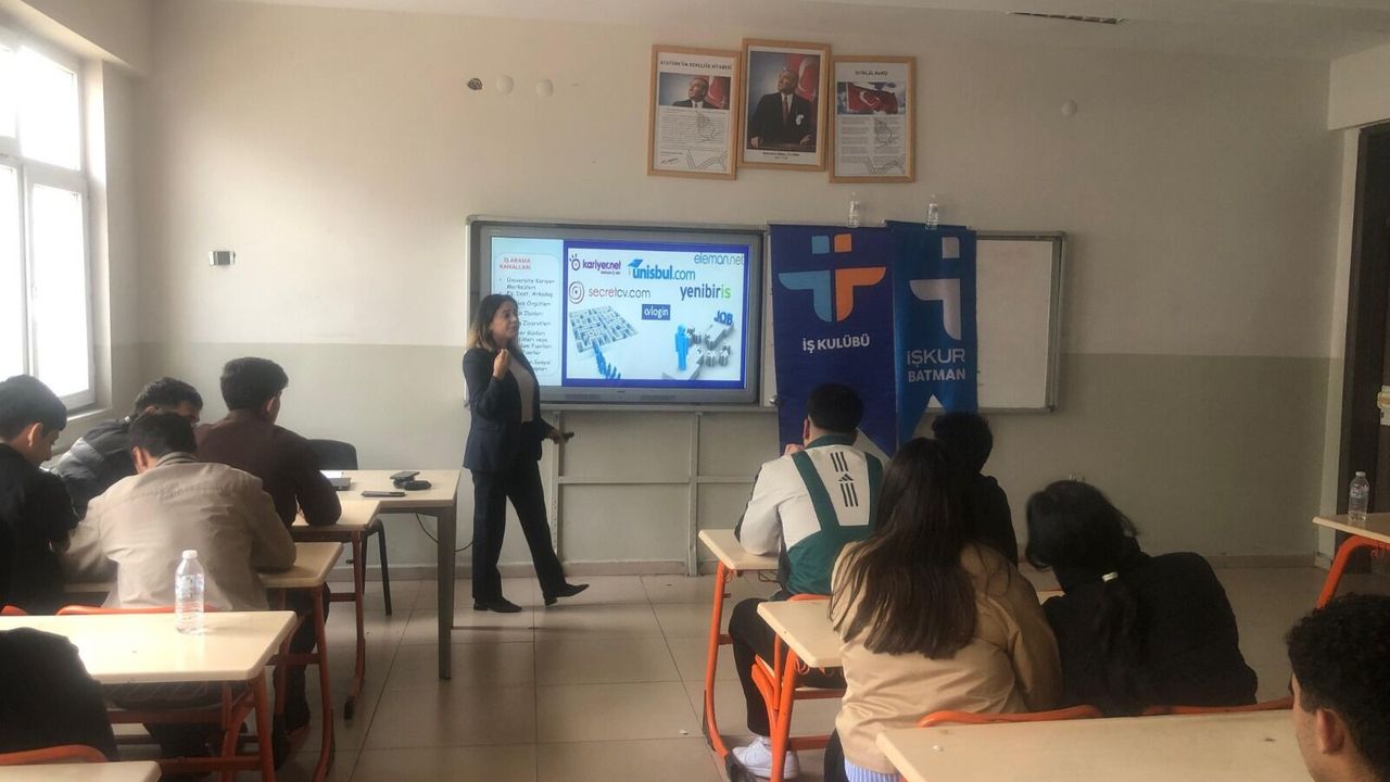 Batman Çalışma ve İş Kurumu İl Müdürlüğü’nün meslek danışmanları tarafından yürütülen etkinlik, lisenin öğrencilerine geleceğe yönelik somut adımlar atmaları konusunda rehberlik etmeyi amaçladı. Sunum, Türkiye İş Kurumu’nun (İŞKUR) genç istihdamını güçlendirmek için hayata geçirdiği kapsamlı “Gençliğin Üretim Çağı (GÜÇ)” projesi kapsamında düzenlendi.