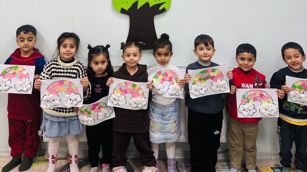 Kursun son etkinliğinde çocuklar, kendi hayal dünyalarını yansıttıkları “Gökkuşağı ve Bulut” temalı sanat çalışmalarını sergiledi. Pamuk ve renkli kâğıtlar kullanılarak hazırlanan etkinlikte minikler; renkleri tanıma, kesme ve yapıştırma gibi temel motor becerilerini geliştirirken, grup içinde birlikte çalışma deneyimi de kazandı.