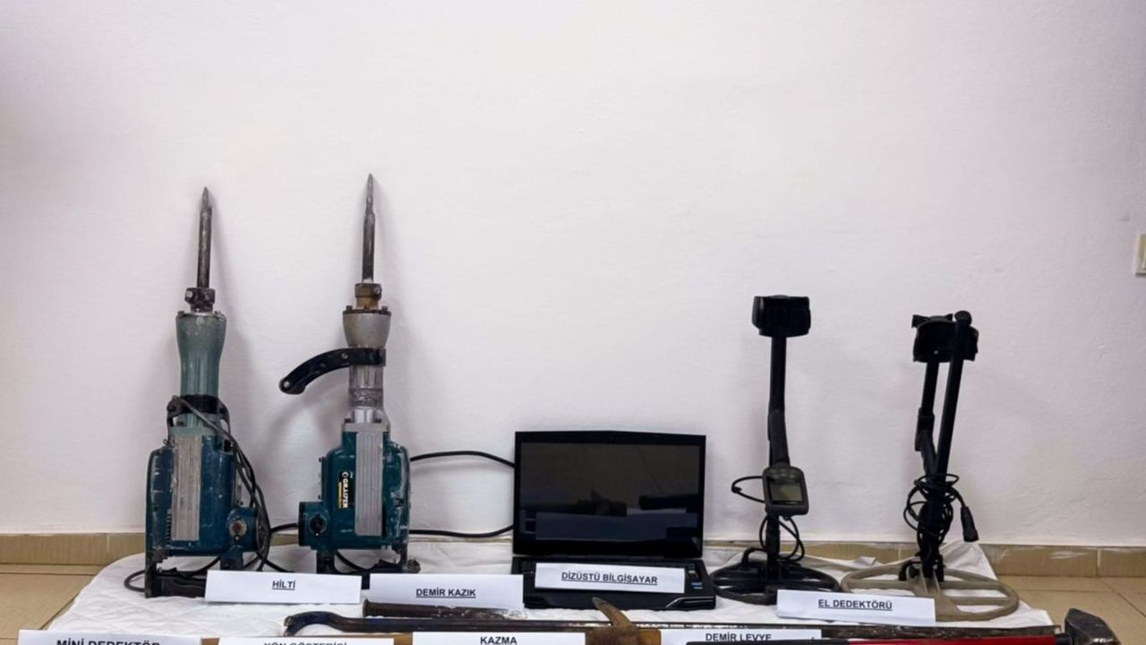 Operasyonda kaçak kazı olayında kullanılan 2 adet el dedektörü, 1 adet mini dedektör, 1 adet yön gösterici, 1 adet dizüstü bilgisayar, 2 adet hilti ve çok sayıda kazı malzemesi ele geçirildi.