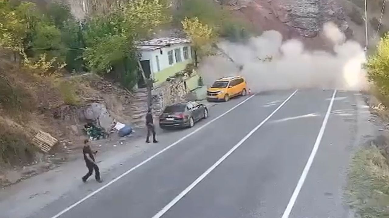 Bu sırada, dağ yamacından büyük kaya parçaları koparak yola doğru yuvarlandı. Kaya parçalarının taksiye yöneldiğini fark eden otomobil sürücüsü, taksi şoförüne seslenerek uyarıda bulundu. Uyarıyı duyan taksici, saniyeler içinde koşarak tehlikeli bölgeden uzaklaştı.