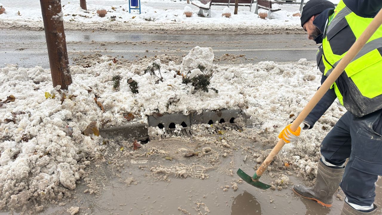 Eriyen kar sularının daha rahat ve sağlıklı şekilde tahliye edilebilmesi amacıyla mazgalların önü titizlikle temizleniyor.